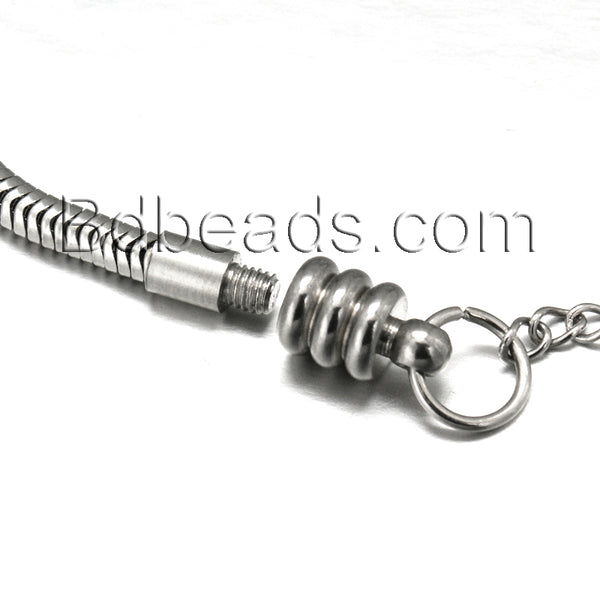These european style chain bracelets are 304 grade stainless steel so it will not tarnish and is great for those with metal allergies. The chain is 3mm thick and the length is adjustable because there are chain extensions added on the end of the bracelets. Wear as is or one end of the bracelet screws off so you can add beads and charms, the beads and/or charms you add need to have at least a 4mm hole.