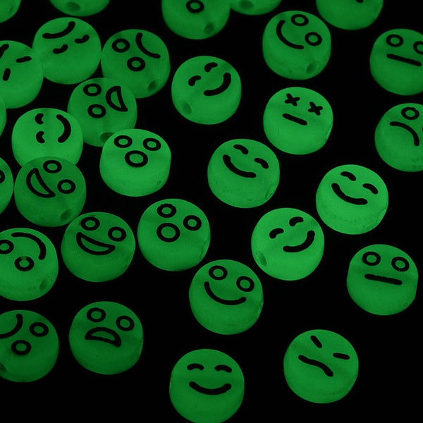 These acrylic beads are a translucent grayish white until in the dark and then they glow green. The many different facial expressions are in black and raised slightly. They measure 7mm x 3.5mm and have a 1.2mm hole.
