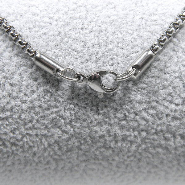 This box chain is 304 grade stainless, great for those with metal allergies. The chain measures 24 inches long and 2.3mm thick. Closes securely with a lobster claw clasp. Great quality chain and clasp, strong and durable.