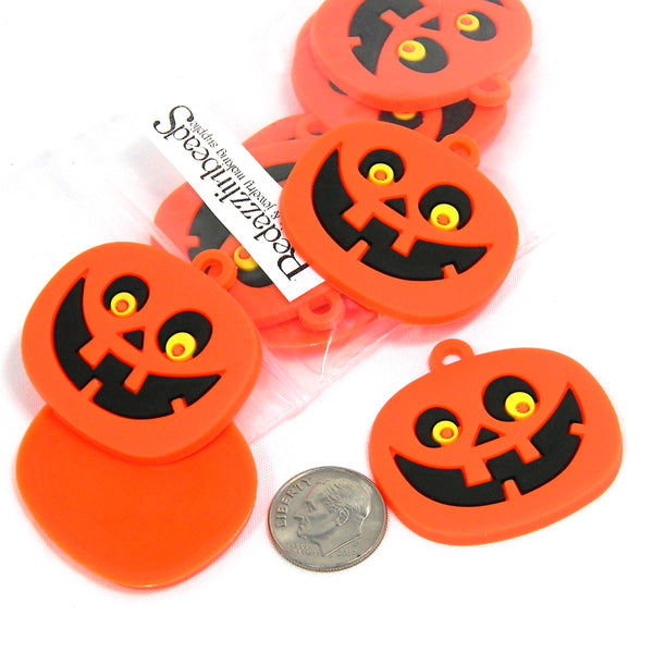 These Jack-o-Lantern pendants are PVC plastic which resembles rubber. They are 2.5mm thick and very bendable and flexible. They measure 1 3/8 inch (39mm) from the top of the loop to the bottom of the pumpkin and 1 1/2 inch (38mm) wide. The mouth is inlaid with black pvc and the eyes are inlaid with black, yellow and orange pvc. They have a big 3.3mm hole for hanging at the top.
